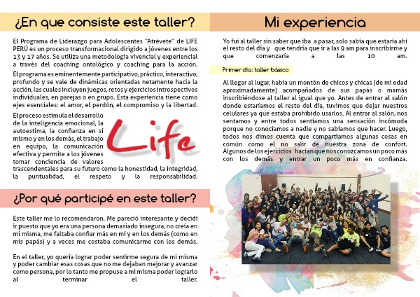 Al llegar al lugar, había un montón de chicos y chicas (de mi edad aproximadamente) acompañados de sus papás o mamás inscribiéndose al taller al igual que yo. Antes de entrar al salón donde estaríamos el resto del día, tuvimos que dejar nuestros celulares ya que estaba prohibido usarlos. Al entrar al salón, nos sentamos y entre todos sentíamos una sensación incómoda porque no conocíamos a nadie y no sabíamos que hacer. Luego, todos nos dimos cuenta que compartíamos algunas cosas en común como el no salir de nuestra zona de confort.