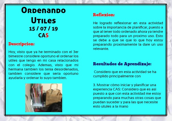 Hoy, visto que ya he terminado con el 3er bimestre considere oportuno el ordenar los utiles que tengo en mi casa relacionados con el colegio. Ademas, visto que mi hermana tambien los tenia desordenados, tambien considere que seria oportuno ayudarla y ordenar lo suyo tambien.