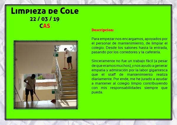 Sinceramente no fue un trabajo fácil (a pesar de que eramos muchos), y nos ayudo a generar empatia y admiración por la labor gigantesca que el staff de mantenimiento realiza diariamente. Por ende, me he jurado a ayudar a mantener al colegio limpio contribuyendo con mis responsabilidades siempre que pueda.