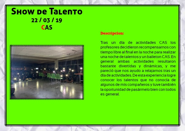 Tras un día de actividades CAS los profesores decidieron recompensarnos con tiempo libre al final en la noche para realizar una noche de talentos y un baileton CAS. En general ambas actividades resultaron bastante divertidas y dinámicas, y me pareció que nos ayudo a relajarnos tras un día de actividades. De esta experiencia logre conocer los talentos que no conocía de algunos de mis compañeros y tuve también la oportunidad de pasármelo bien con todos es general.
