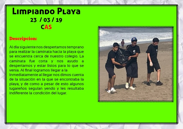 Al día siguiente nos despertamos temprano para realizar la caminata hacia la playa que se encuentra cerca de nuestro colegio. La caminata fue corta y nos ayudo a despertarnos y estar listos para lo que se venia. Al final logramos llegar a la