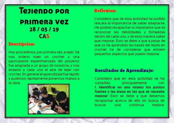 Hoy procedimos, por primera vez, a tejer. Se nos ordeno traer un crochet y una participante experimentada del proyecto fue asignada a un grupo de nosotros, y nos enseno a cada uno el arte de tejer con crochet. En general el aprendizaje fue rĂ¡pido y pudimos rĂ¡pidamente ponernos manos a la obra.