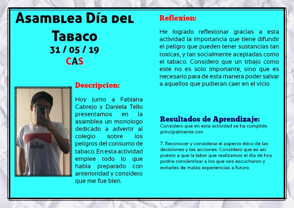 Hoy junto a Fabiana Cabrejo y Daniela Tello presentamos en la asamblea un monologo dedicado a advertir al colegio sobre los peligros del consumo de tabaco. En esta actividad emplee todo lo que habia preparado con anterioridad y considero que me fue bien.