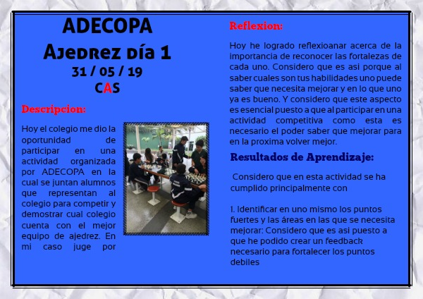 Hoy el colegio me dio la oportunidad de participar en una actividad organizada por ADECOPA en la cual se juntan alumnos que representan al colegio para competir y demostrar cual colegio cuenta con el mejor equipo de ajedrez. En mi caso juge por secundaria y logre ganar la 3 partidas del dia de hoy.