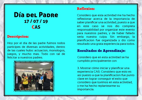 Considero que esta actividad me ha hecho reflexionar acerca de la importancia de saber planificar una actividad, puesto a que en este caso se nos dio completa responsabilidad por organizar este evento para nuestros padres, y de haber fallado seria nuestra culpa. Sin embargo, la planificacion fue organizada y dio como resultado una grata experiencia para todos.
