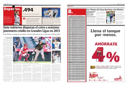 H2 H3 HR CE BB SO BR AVE A. Beltré Tex. 358 53 114 22 0 20 53 22 42 0. 318 A. Pujols Anah. 345 45 87 18 0 15 56 39 48 0. 252 A. De Aza W. S 335 50 87 16 1 10 40 29 88 10. 260 A. Casilla Balt. 86 10 20 4 1 1 9 6 13 6. 233 A. Soriano Cubs 326 43 86 22 1 15 47 11 79 10. 264 A. Ramírez Milw. 181 21 49 11 0 5 26 23 38 0. 271 C. Gómez Milw. 320 49 97 20 9 13 42 15 77 21. 303 C. Peña Hous. 267 38 57 13 1 8 25 41 84 1. 213 C. Santana Clev. 292 39 77 21 0 11 40 50 62 1. 264 D. Ortiz Bos 272 47 90 22 2 19 65 41 41 3. 331 E. Núñez NNY 95 10 20 4 1 0 7 8 20 2. 211 E. Encarnación Tor. 331 58 88 16 1 23 68 45 43 3. 266 E. Herrera Dod. 7 0 2 0 0 0 0 0 1 0. 272 E. Bonifacio Tor. 221 26 46 14 1 2 15 10 54 11. 208 E. Beltré Tex. 17 4 5 0 0 0 1 0 0 1. 294 E. Aybar Anah 271 30 78 13 2 3 34 8 27 4. 288 H. Ramírez Dodg. 115 26 47 10 2 8 24 9 14 4. 409 J. Segura Milw 357 50 114 10 8 11 36 15 45 27. 319 J. Paredes Houst 101 7 18 4 0 1 8 6 38 4. 178 J. Peralta Det. 326 38 98 24 0 7 42 29 83 2. 301 J. Valdespin Mets 131 16 25 3 1 4 16 8 26 4. 191 J. Bautista Tor. 318 60 83 18 0 20 53 50 63 6. 261 J. Reyes Tor. 97 15 31 3 0 4 12 7 9 7. 320 J. Francisco Milw 197 23 48 4 1 11 31 18 69 0. 244 J. Lagares Mets 139 11 32 10 1 1 11 4 38 0. 230 J. Pérez SFco. 42 1 10 1 0 0 3 3 11 0. 238 J. Uribe Dodg 180 23 49 10 1 5 28 20 39 1. 272 J. Borbón Cubs 89 10 17 1 1 1 3 12 19 7. 191 M. Ozuna Flor. 249 29 68 17 3 3 29 10 51 5. 273 M. Machado Balt. 396 55 126 39 3 7 45 16 68 6. 318 M. Cabrera Tor. 309 34 86 13 2 3 29 21 43 2. 278 M. Tejada Kans. 89 9 26 3 0 2 11 3 17 0. 292 N. Cruz Tex. 333 40 92 17 0 22 68 27 89 5. 276 P. Alvarez Pitts 292 38 74 9 0 23 60 26 106 1. 253 P. Ciriaco SD. 114 9 26 3 2 2 8 9 22 8. 228 P. Florimón Minn 222 21 50 9 0 4 28 18 51 8. 225 P. Polanco Flor. 258 27 65 9 0 1 15 18 22 1. 252 R. Santiago Det. 77 10 13 5 1 0 4 8 15 0. 169 R. Canó NNY 341 52 102 18 0 21 62 44 51 5. 299 S. Castro Cubs 371 41 86 20 1 5 27 15 70 7. 232 S. Marte Pitt 356 59 103 17 8 9 27 13 86 28. 289 T. Abreu SFco. 55 11 17 7 1 1 7 4 15 0. 309 W. Castillo Cubs 236 23 63 15 0 2 15 12 58 1. 267 W. Rosario Col. 271 38 75 14 1 13 45 14 64 4. 277 Z. Almonte NYY 70 8 19 4 0 1 8 5 12 3. 271 LANZADORES EQ. G / P JS IL CL H HR BB SO EFEC Alf. Fígaro Milw. 1-2 0 53.1 16 60 13 12 44 4.64 A. Colomé Tam. 1-0 0 16.0 4 14 2 9 12 2.25 A. Ogando Tex. 4-2 0 55.1 18 46 6 22 43 2.93 B. Colón Oak. 12-3 0 120.1 36 118 9 15 66 2.69 C. Villanueva Cubs 2-4 0. 333 74.1 28 66 20 57 3.39 E. Volquez SD 6-7 0 104.2 62 118 8 50 88 5.33 E. Santana Kans. 5-5 0 118.0 38 100 16 24 94 2.90 E. Rogers Tor. 3-4 0 65.2 28 69 6 20 42 3.84 F. Liriano Pitts. 9-3 0 76.0 17 63 3 28 80 2.00 I. Nova NNY 4-2 0 52.0 21 51 3 16 54 3.63 J. Nicasio Col. 4-4 0 81.1 48 89 10 30 56 5.31 J. Cueto Cinc. 4-2 0 48.2 18 38 6 14 41 3.33 R. Hernández Tam. 4-10 0 102.1 56 111 17 24 78 4.93 S. Deduno Minn. 4-4 0 55.1 24 56 4 17 28 3.90 U. Jiménez Clev. 7-4 0 94.2 46 86 13 51 92 4.37 W. Rodríguez Pitts 6-4 0 62.2 26 58 10 12 46 3.59 W. Peralta Milw. 6-9 0 106.1 57 117 10 43 62 4.82( No incluye los juegos de anoche- A. Báez).