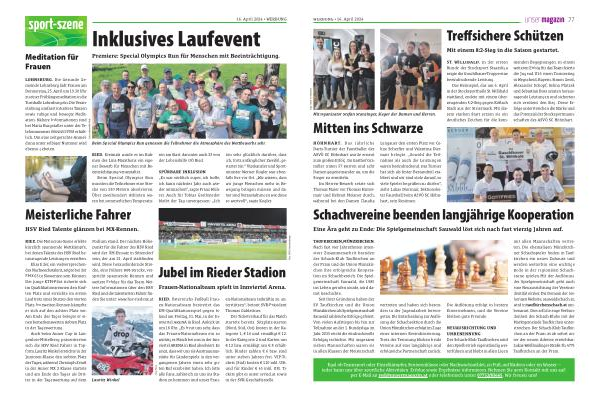 Egal ob Teamsport oder Einzelkämpfer , Seniorenklasse oder Nachwuchsathlet , zu Fuß , auf Rädern oder im Wasser – jeder kann uns über sportliche Aktivitäten , Erfolge sowie Ergebnisse informieren . Nehmen Sie gern Kontakt mit uns auf : per E-Mail an red @ unsermagazin . at oder telefonisch unter 07752 / 83665 . Wir freuen uns !