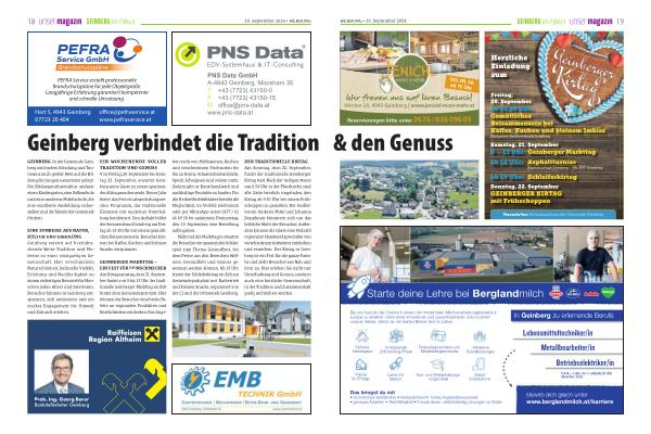 GEINBERGER MARKTTAG – EIN FEST FÜR FEINSCHMECKER Am Kirtagsamstag , dem 21 . September findet von 9 bis 13 Uhr der traditionelle Geinberger Markttag im Zelt hinter dem Gemeindeamt statt . Hier können die Besucher eine breite Palette an regionalen Produkten und Köstlichkeiten entdecken . Das Angebot