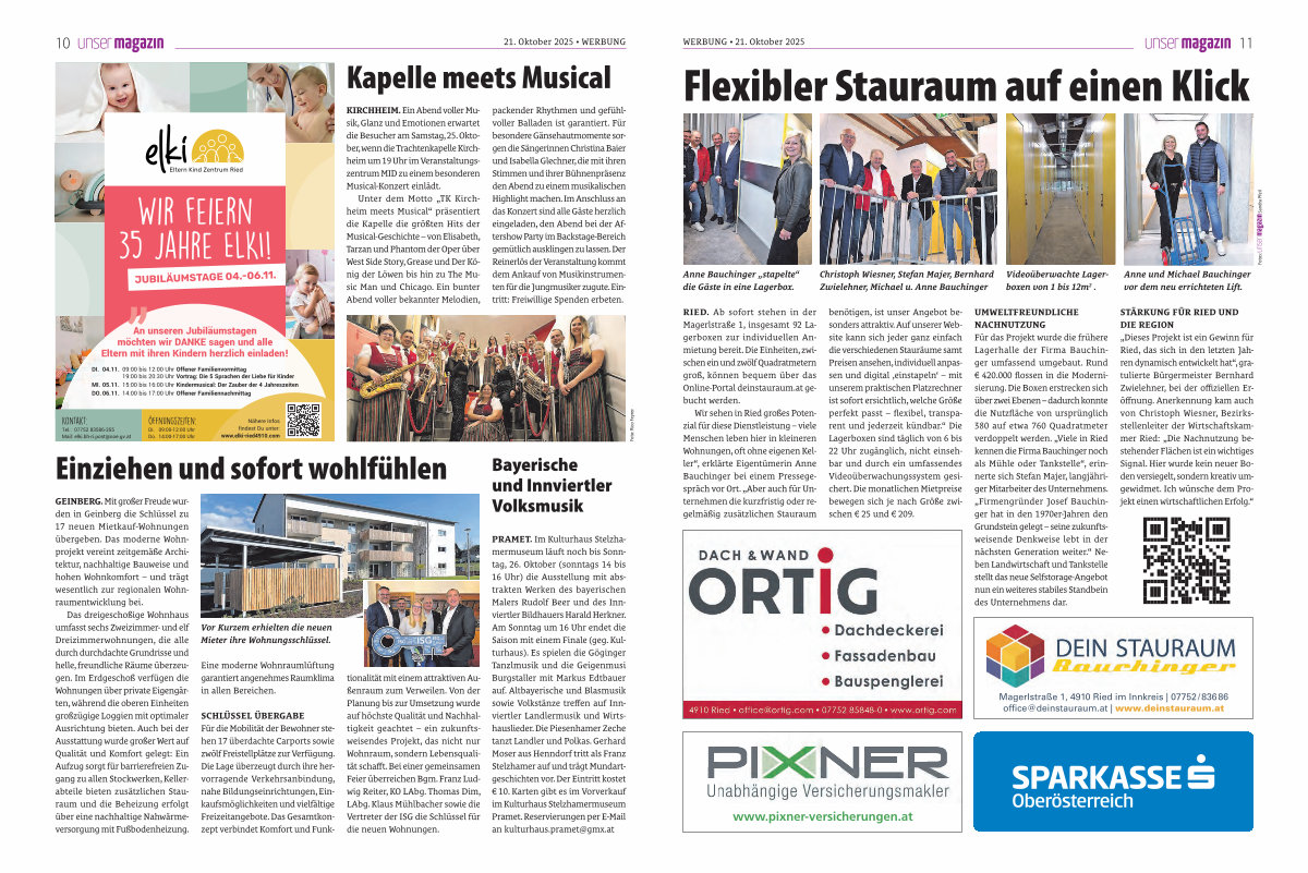 UMWELTFREUNDLICHE NACHNUTZUNG Für das Projekt wurde die frühere Lagerhalle der Firma Bauchinger umfassend umgebaut. Rund € 420.000 flossen in die Modernisierung. Die Boxen erstrecken sich über zwei Ebenen – dadurch konnte die Nutzfläche von ursprünglich 380 auf etwa 760 Quadratmeter verdoppelt werden. „ Viele in Ried kennen die Firma Bauchinger noch als Mühle oder Tankstelle“, erinnerte sich Stefan Majer, langjähriger Mitarbeiter des Unternehmens. „ Firmengründer Josef Bauchinger hat in den 1970er-Jahren den Grundstein gelegt – seine zukunftsweisende Denkweise lebt in der nächsten Generation weiter.“ Neben Landwirtschaft und Tankstelle stellt das neue Selfstorage-Angebot nun ein weiteres stabiles Standbein des Unternehmens dar. |
