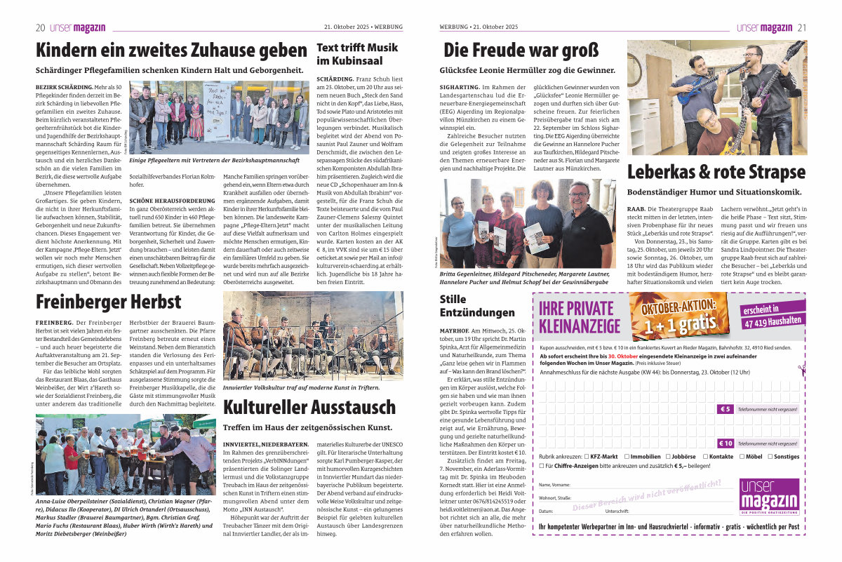 Ab sofort erscheint Ihre bis 30. Oktober eingesendete Kleinanzeige in zwei aufeinander folgenden Wochen im Unser Magazin.( Preis inklusive Steuer)