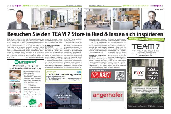 „ Für all jene , die auf der Suche nach kreativer Inspiration sind und die Schönheit nachhaltiger Designkonzepte und natürlicher Materialien erleben möchten , hat der weltweit größte TEAM 7 Store in Ried seine Türen geöffnet , um Sie herzlich willkommen zu heißen . Hier haben Sie die Möglichkeit , die einzigartige Atmosphäre des Stores zu erkunden und sich von den nachhaltigen Designkonzepten und der Verwendung natürlicher Materialien inspirieren zu lassen .“, so Storeleiter Gerald Gruber .