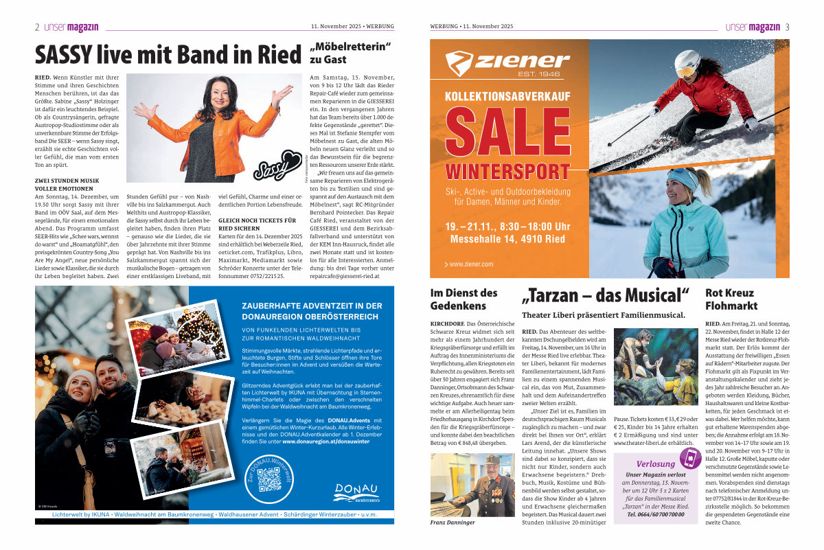 ZWEI STUNDEN MUSIK VOLLER EMOTIONEN Am Sonntag, 14. Dezember, um 19.30 Uhr sorgt Sassy mit ihrer Band im OÖV Saal, auf dem Messegelände, für einen emotionalen Abend. Das Programm umfasst SEER-Hits wie „ Schee wars, wennst do warst“ und „ Hoamatgfühl“, den preisgekrönten Country-Song „ You Are My Angel“, neue persönliche Lieder sowie Klassiker, die sie durch ihr Leben begleitet haben. Zwei