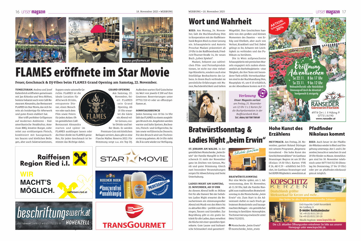 TUMELTSHAM. Andrea und Josef Kaltenböck eröffneten gemeinsam mit Jan Krkoska und Vera Höfner, bestens bekannt auch vom Café-Restaurant Alexandra, das Restaurant FLAMES im Star Movie, das sich bereits als Insidertipp für Afterwork und gutes Essen etabliert hat.