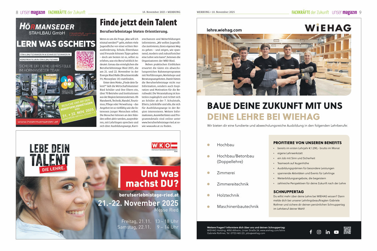 Wenn es um die Frage „ Was will ich einmal werden?“ geht, stehen viele Jugendliche vor einer echten Herausforderung. Schule, Elternhaus und Freunde können Tipps geben – doch am besten ist es, selbst zu erleben, was ein Beruf wirklich bedeutet. Genau das ermöglichen die Berufserlebnistage Ried 2025, die am 21. und 22. November in der Energie Ried Halle( Brucknerstraße 39, Messeplatz 18) stattfinden.