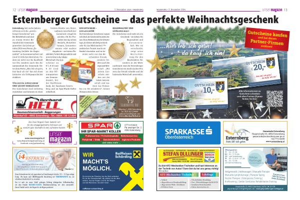 EIN GUTSCHEIN – EIN GESCHENK Die Esternberger Gutscheine eignen sich ideal als Geschenk für jeden Anlass . Ob zu Weihnachten , für Geburtstage , als kleines Wichtelgeschenk oder für das Nikolosackerl . Ihr praktisches Format macht sie flexibel einsetzbar und sie bereiten nicht nur den Beschenkten Freude , sondern fördern auch die regionale Wirtschaft . „ Mit jedem Gutschein stärken wir die lokale Gemeinschaft und machen das Einkaufen vor Ort attraktiver “, betont Obmann Alois Ortner . |