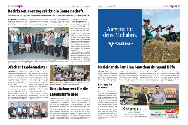 AKTIVE BETEILIGUNG AM GESELLSCHAFTSLEBEN In seinem Bericht präsentierte Nömaier das vielfältige Angebot des Seniorenbundes im Bezirk Ried – von gesellschaftlichen Veranstaltungen bis hin zu Beratungs- und Serviceleistungen . Besonders hob er die engagierte Teilnahme der Mitglieder hervor , die den Erfolg der Organisation entscheidend prägen . Landesobmann LH a . D . Dr . Josef Pühringer würdigte in seinem Grußwort die Arbeit des Bezirks : „ Ein so aktiver Bezirk wie Ried braucht nicht nur einen engagierten Obmann , sondern auch ein starkes Team und aktive Ortsgruppen .