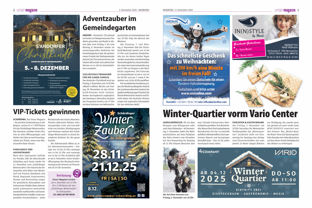 Verlosung Unser Magazin verlost am 4. Dezember um 13 Uhr 20 x 2 VIP-Karten für den „ Schärdinger Winterzauber“ im Seilergraben. Tel. 0664 / 60 700 700 00