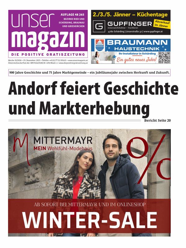 Woche 01 / 2026 • 29. Dezember 2025 • Telefon + 43( 0) 77 52 / 836 65 • www. unsermagazin. at Österreichische Post AG • RM 91A491002 K • 4910 Ried i. I. • www. diepositivegratiszeitung. at