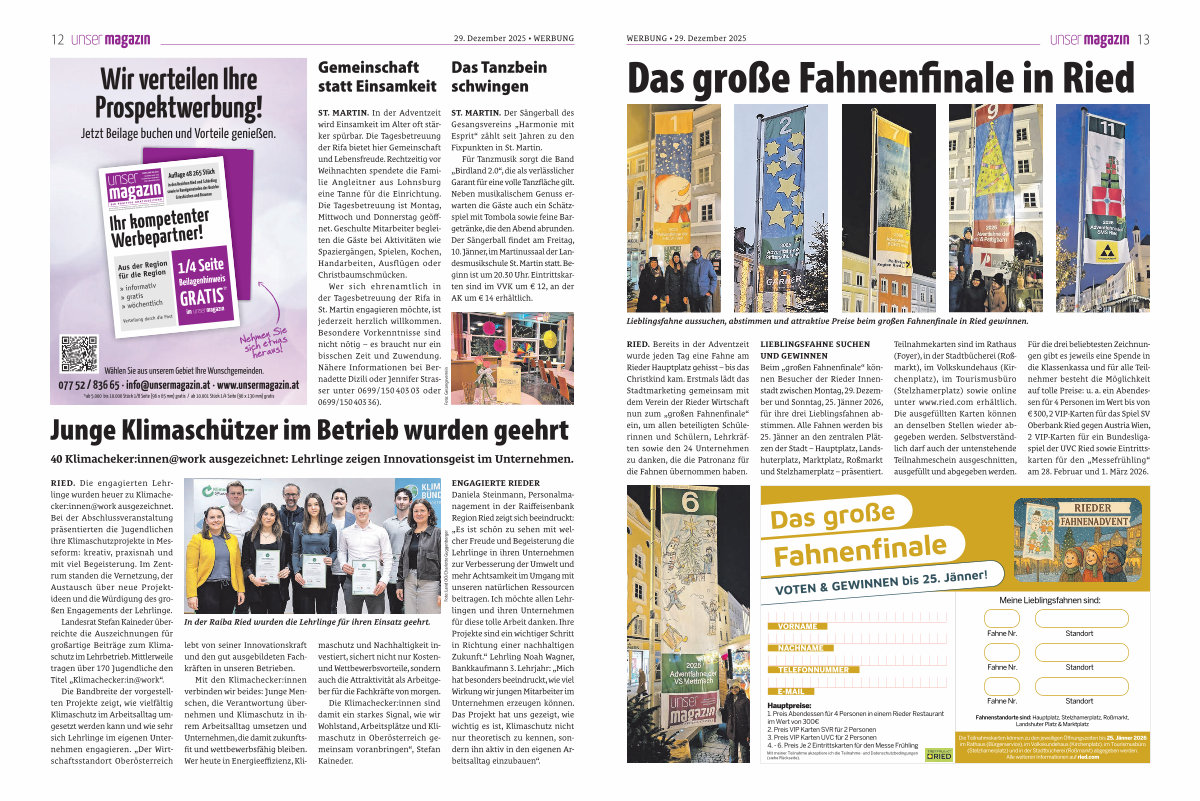 RIED. Bereits in der Adventzeit wurde jeden Tag eine Fahne am Rieder Hauptplatz gehisst – bis das Christkind kam. Erstmals lädt das Stadtmarketing gemeinsam mit dem Verein der Rieder Wirtschaft nun zum „ großen Fahnenfinale“ ein, um allen beteiligten Schülerinnen und Schülern, Lehrkräften sowie den 24 Unternehmen zu danken, die die Patronanz für die Fahnen übernommen haben. |