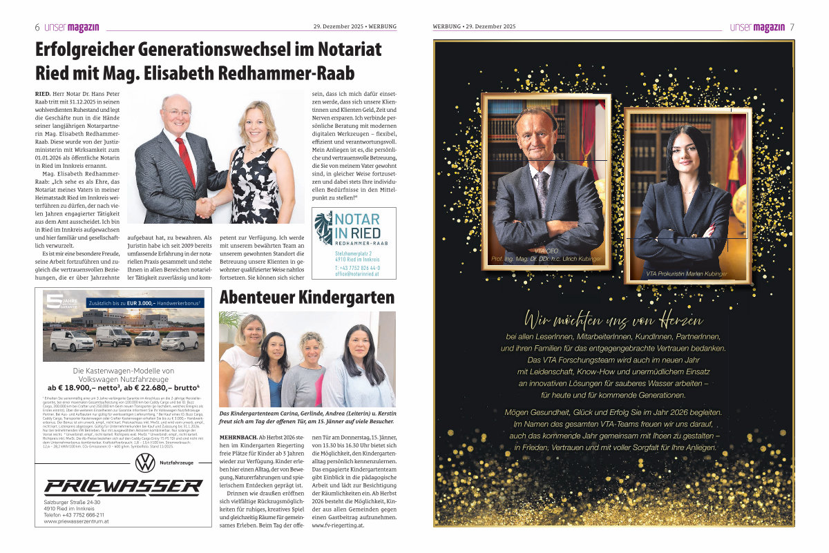 bei allen LeserInnen, MitarbeiterInnen, KundInnen, PartnerInnen ‚ und ihren Familien für das entgegengebrachte Vertrauen bedanken. Das VTA Forschungsteam wird auch im neuen Jahr mit Leidenschaft, Know-How und unermüdlichem Einsatz an innovativen Lösungen für sauberes Wasser arbeiten – für heute und für kommende Generationen.