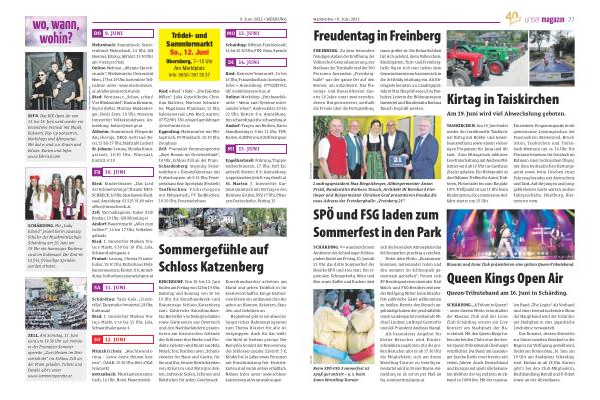 Ried : 4 Reed ´ s Sake – „ Um FaGottes Willen “, Julia Gutschlhofer , Christian Walcher , Marlene Schwärzler , Magdalena Pramhaas , 11 Uhr , Salesianersaal LMS Ried ; Karten : 07752 / 901-330 , eduard . geroldinger @ ried-innkreis . at Eggerding : Maibaumfest mit Mittagstisch , FF Maasbach , 10.30 Uhr , Zeughaus Zell : Pramtaler Sommeroperette „ Zwei Herzen im Dreivierteltakt “, 18 Uhr , Schloss Zell an der Pram Schardenberg : Segnung Feuerwehrhaus + Einsatzfahrzeuge mit Frühschoppen , ab 9.15 Uhr , Feuerwehrhaus bzw . Sportplatz ( Festzelt ) Taufkirchen : Frühschoppen mit Mittagstisch , FF Taufkirchen , 10.30 Uhr , Feuerwehrhaus