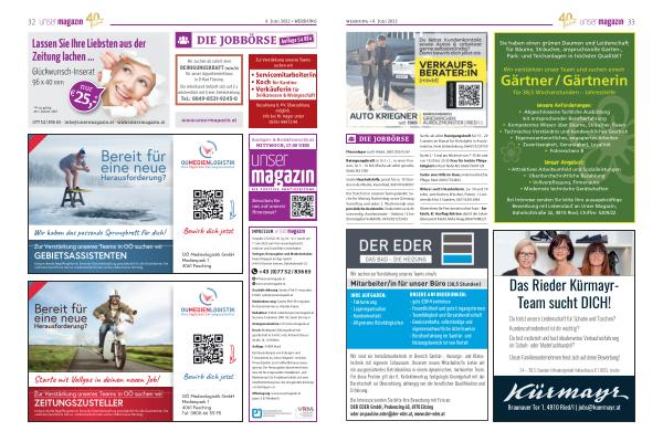 Bei Interesse senden Sie bitte Ihre aussagekräftige Bewerbung mit Lebenslauf an Unser Magazin , Bahnhofstraße 32 , 4910 Ried , Chiffre : 5209 / 22
