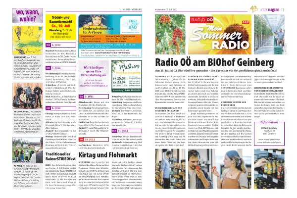 Altschwendt : Messe mit den Choryfeen , 19 Uhr , Pfarrkirche Mörschwang : Mörschwanger Sommernacht mit „ 5e samma “ und „ IBO – Innviertler Böhmische “, Musikverein , ab 19 Uhr , vor dem Gemeindeamt Hofkirchen : Feuerlöscherüberprüfung , 8 bis 16 Uhr , Feuerwehrhaus Andorf : Pramtal Flohmarkt für Jedermann , 7 bis 13 Uhr Volksfestgelände