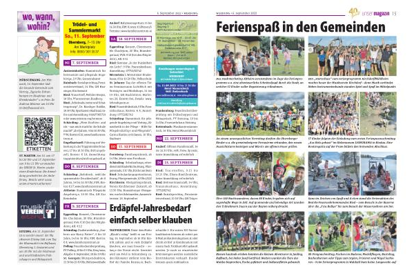 Freinberg : Familienpicknick , ab 14 Uhr , Wiese ums Forsthaus Schärding : Schulanfangsgottesdienst mit Kinderkirche , Evang . Pfarrgemeinde , 9.30 Uhr , Kirche am Stein Ried : Schulanfangsgottesdienst , Evang . Pfarrgemeinde , 10 Uhr , EGZ Kirchheim : Obstgartenpicknick , Verein Kirchheimer Zukunft , ab 13.30 Uhr , Kraxenberger Obstgarten ; nur bei Schönwetter ; Ausweichtermin : 18 . September