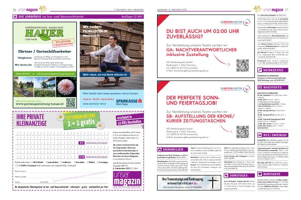 Ab sofort erscheint Ihre bis 30 . September 2022 eingesendete Kleinanzeige in zwei aufeinander folgenden Wochen im Unser Magazin . ( Preis inklusive Steuer )