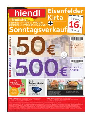 1 ) Gültig bei Neuaufträgen für alle Artikel aus den Abteilungen Haushaltswaren & Accessoires , Heimtextilien , Leuchten , Teppiche und Gardinen , sowie die Baby-Exklusivmarken Jimmy Lee und Patinio , auch im Online Shop einmalig mit Code XXXL-50 . Ausgenommen : in dieser Werbung angebotene Ware , im Online Shop als „ Werbung “ und " eXtra " sowie in der Ausstellung als „ Bestpreis “ gekennzeichnete Artikel , Gutscheinkauf , Bücher sowie Artikel der Marken Blomus , Boxxx und DEPOT . Keine weiteren Konditionen möglich . Keine Barauszahlung . Gültig bis 01.10.2022 , bei Hiendl in Passau und Neuötting . 2 ) Gültig bei Neuaufträgen für Möbel , Küchen und Matratzen , auch im Online Shop mit Code XXXLDANKE-500 . Ausgenommen : in dieser Werbung angebotene Ware , bereits reduzierte Ware , im Online Shop als „ Werbung “ und „ eXtra “ sowie in der Ausstellung als „ Bestpreis / Bester Preis “ und „ Dauertiefpreis “ gekennzeichnete Artikel , Gutscheinkauf , Bücher sowie Artikel der Abteilung Baby & Kinder . Soweit anwendbar , Kombination mit dem „ Hauspreis “ möglich , darüber hinaus keine weiteren Konditionen möglich . Keine Barauszahlung . Gültig bis 01.10.2022 , bei Hiendl in Passau und Neuötting . G ) Symbolfoto . Pro Person nur ein Gutschein einlösbar . Gutschein bitte vor der Bestellung abgeben . Solange Vorrat reicht . Allergen-Informationen erhalten Sie bei unseren Mitarbeitenden . Zusatzstoffnummern : siehe Speisekarte . Gültig vom 13.10 . bis 15.10.2022 , bei Hiendl in Neuötting bis 16.10.2022 .