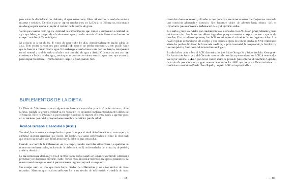 para evitar la deshidratación. Además, el agua actúa como filtro del cuerpo, lavando las células muertas y residuos. Debido a que se quema mucha grasa en La Dieta de 3 Semanas, necesitarás mucha agua para ayudar a limpiar el residuo de la quema de grasa.