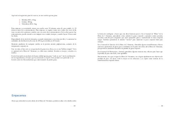 la forma de configurar y hacer que esta dieta funcione para ti. En el manual de“ Dieta” de la Dieta de 3 Semanas, aprenderás cómo calcular la grasa corporal y aprender cuánta proteína necesitas cada día para asegurarte que estás quemando grasa y manteniendo la masa corporal magra. También aprenderás el método " secreto " para mantener tu peso corporal ideal para siempre.