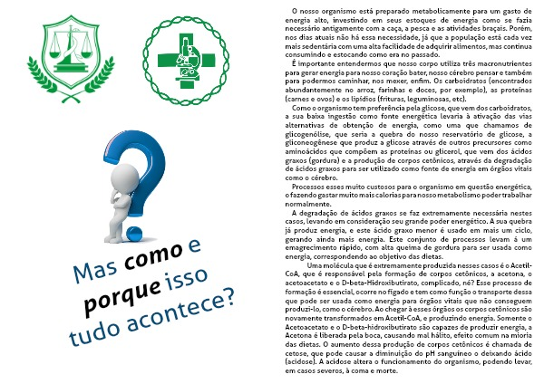 Como o organismo tem preferência pela glicose, que vem dos carboidratos, a sua baixa ingestão como fonte energética levaria à ativação das vias alternativas de obtenção de energia, como uma que chamamos de glicogenólise, que seria a quebra do nosso reservatório de glicose, a gliconeogênese que produz a glicose através de outros precursores como aminoácidos que compõem as proteínas ou glicerol, que vem dos ácidos graxos (gordura) e a produção de corpos cetônicos, através da degradação de ácidos graxos para ser utilizado como fonte de energia em órgãos vitais como o cérebro.
