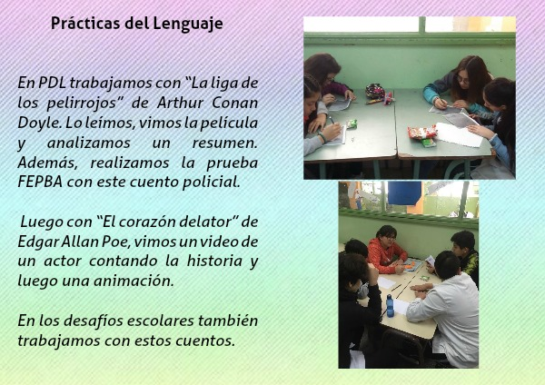 En PDL trabajamos con “La liga de los pelirrojos” de Arthur Conan Doyle. Lo leímos, vimos la película y analizamos un resumen. Además, realizamos la prueba FEPBA con este cuento policial.