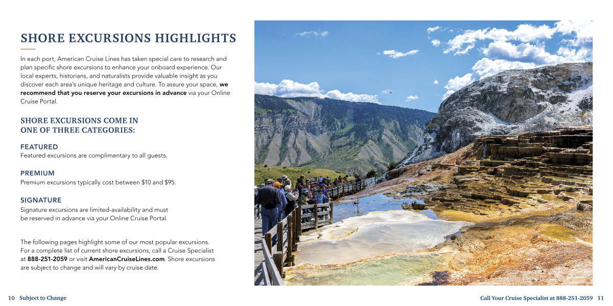 The following pages highlight some of our most popular excursions. For a complete list of current shore excursions, call a Cruise Specialist at 888-251-2059 or visit AmericanCruiseLines. com. Shore excursions are subject to change and will vary by cruise date.