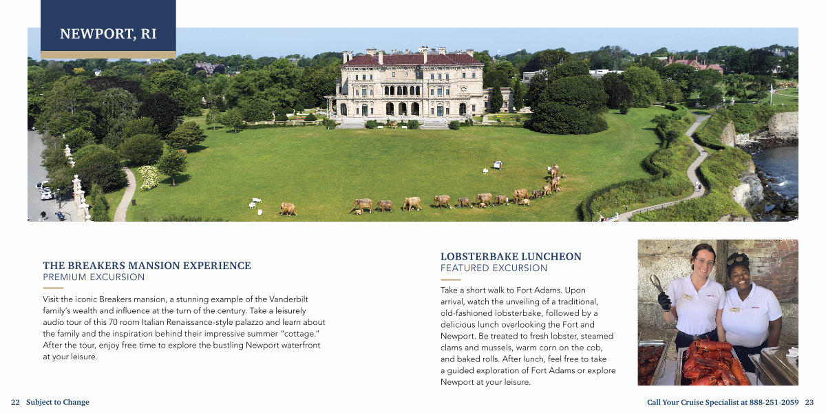 Take a short walk to Fort Adams. Upon arrival, watch the unveiling of a traditional, old-fashioned lobsterbake, followed by a delicious lunch overlooking the Fort and Newport. Be treated to fresh lobster, steamed clams and mussels, warm corn on the cob, and baked rolls. After lunch, feel free to take a guided exploration of Fort Adams or explore Newport at your leisure.