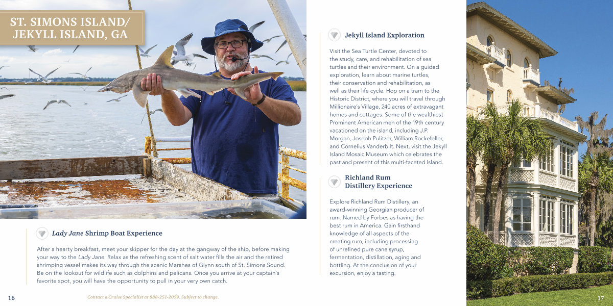 After a hearty breakfast, meet your skipper for the day at the gangway of the ship, before making your way to the Lady Jane. Relax as the refreshing scent of salt water fills the air and the retired shrimping vessel makes its way through the scenic Marshes of Glynn south of St. Simons Sound. Be on the lookout for wildlife such as dolphins and pelicans. Once you arrive at your captain’ s favorite spot, you will have the opportunity to pull in your very own catch.