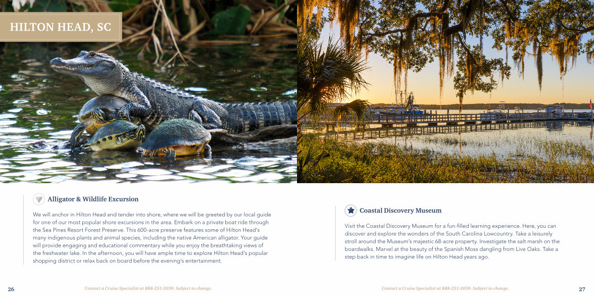 We will anchor in Hilton Head and tender into shore, where we will be greeted by our local guide for one of our most popular shore excursions in the area. Embark on a private boat ride through the Sea Pines Resort Forest Preserve. This 600-acre preserve features some of Hilton Head’ s many indigenous plants and animal species, including the native American alligator. Your guide will provide engaging and educational commentary while you enjoy the breathtaking views of the freshwater lake. In the afternoon, you will have ample time to explore Hilton Head’ s popular shopping district or relax back on board before the evening’ s entertainment.