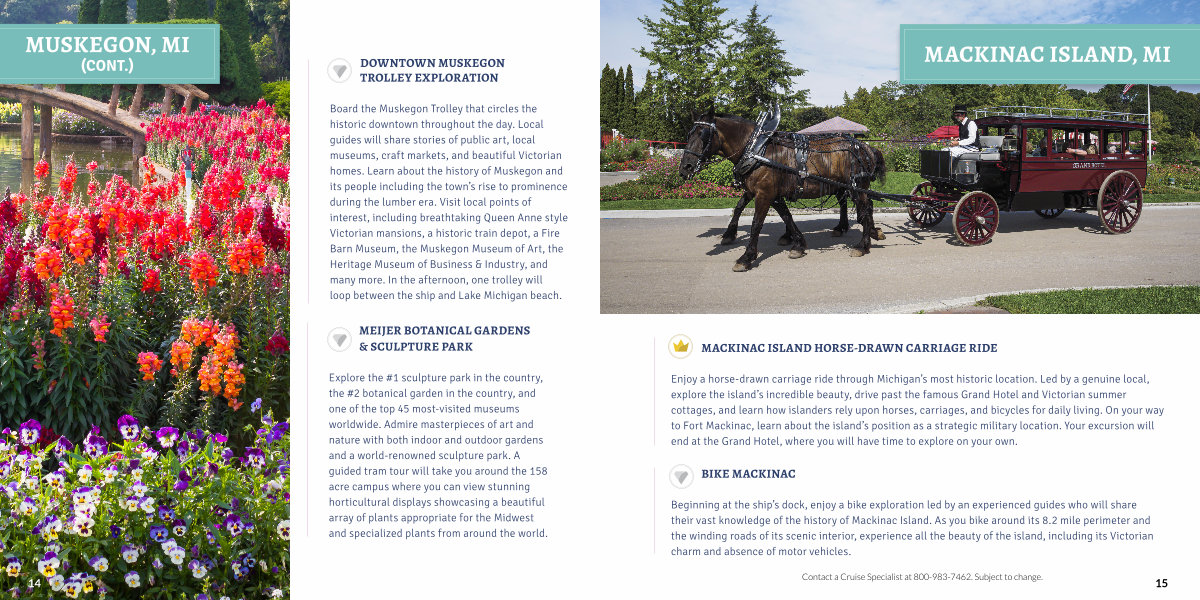 Enjoy a horse-drawn carriage ride through Michigan’ s most historic location. Led by a genuine local, explore the island’ s incredible beauty, drive past the famous Grand Hotel and Victorian summer cottages, and learn how islanders rely upon horses, carriages, and bicycles for daily living. On your way to Fort Mackinac, learn about the island’ s position as a strategic military location. Your excursion will end at the Grand Hotel, where you will have time to explore on your own.