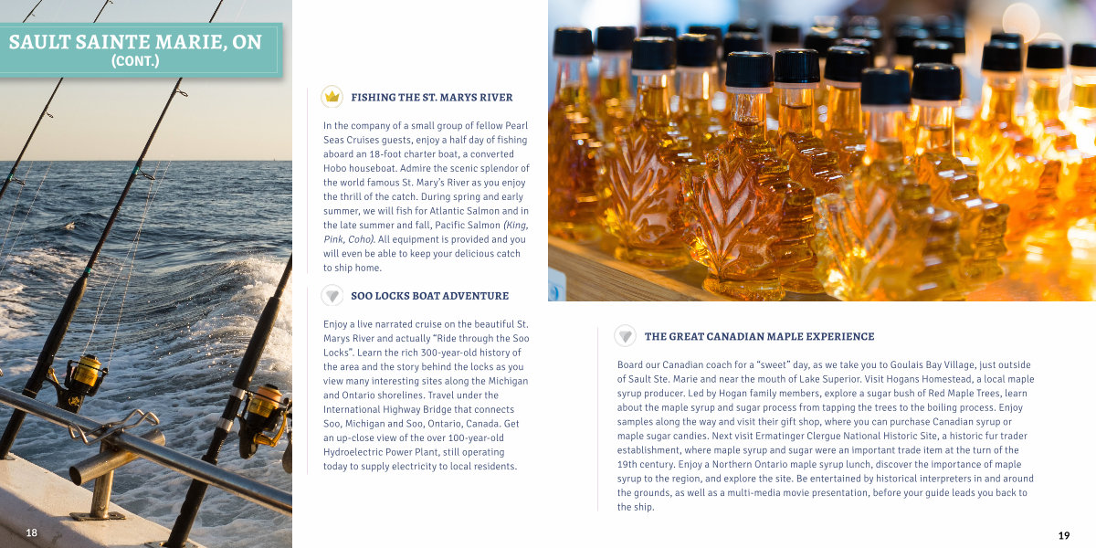 In the company of a small group of fellow Pearl Seas Cruises guests, enjoy a half day of fishing aboard an 18-foot charter boat, a converted Hobo houseboat. Admire the scenic splendor of the world famous St. Mary’ s River as you enjoy the thrill of the catch. During spring and early summer, we will fish for Atlantic Salmon and in the late summer and fall, Pacific Salmon( King, Pink, Coho). All equipment is provided and you will even be able to keep your delicious catch to ship home.