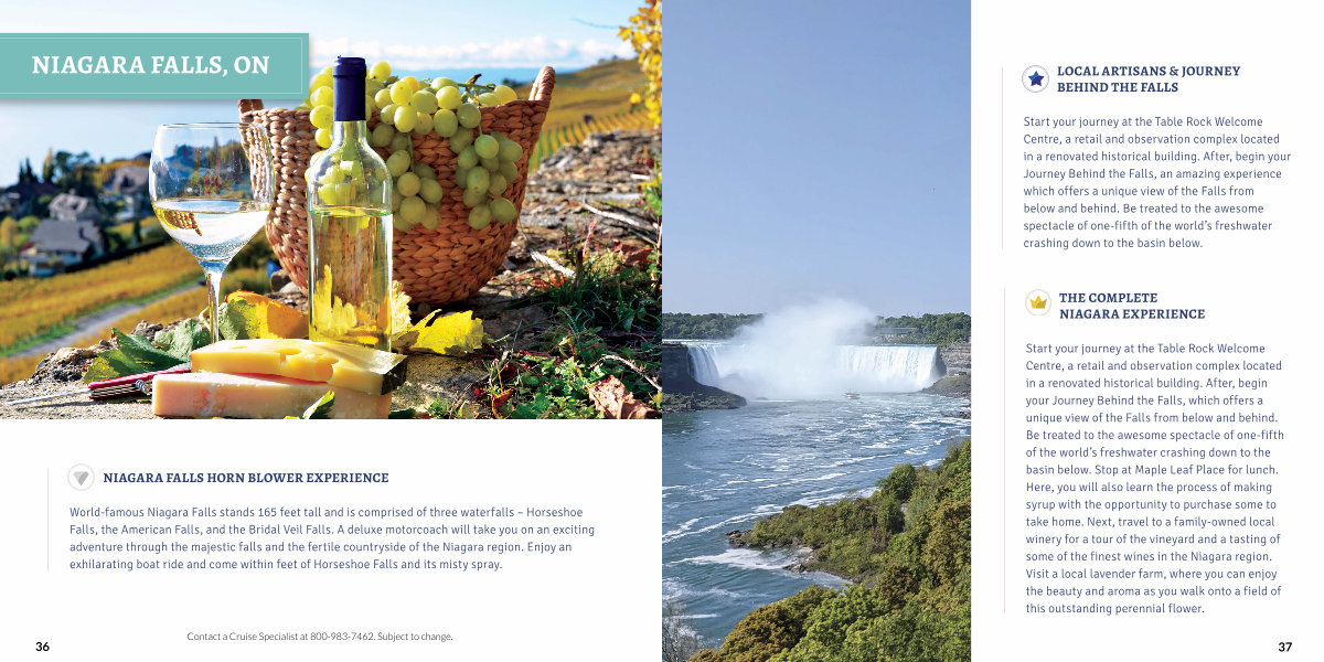 Start your journey at the Table Rock Welcome Centre, a retail and observation complex located in a renovated historical building. After, begin your Journey Behind the Falls, which offers a unique view of the Falls from below and behind. Be treated to the awesome spectacle of one-fifth of the world’ s freshwater crashing down to the basin below. Stop at Maple Leaf Place for lunch. Here, you will also learn the process of making syrup with the opportunity to purchase some to take home. Next, travel to a family-owned local winery for a tour of the vineyard and a tasting of some of the finest wines in the Niagara region. Visit a local lavender farm, where you can enjoy the beauty and aroma as you walk onto a field of this outstanding perennial flower.