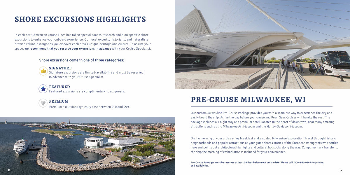 Our custom Milwaukee Pre-Cruise Package provides you with a seamless way to experience the city and easily board the ship. Arrive the day before your cruise and Pearl Seas Cruises will handle the rest. The package includes a 1 night stay at a premium hotel, located in the heart of downtown, near many amazing attractions such as the Milwaukee Art Museum and the Harley-Davidson Museum.