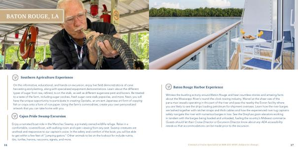 Witness the bustling activity around Baton Rouge and hear countless stories and amazing facts about the Mississippi River ’ s round-the-clock towing industry . Marvel at the sheer size of the pana-max vessels operating in this part of the river and pass the nearby the Exxon facility where you are likely to see the ships loading petroleum for shipment overseas . Learn how the river barges are lashed together with ratchet straps and thick cables and how the experienced river tug captains safely navigate the river with numerous barges in tow . See the Dreyfuss grain elevators working in tandem with the barges being loaded and unloaded , fueling the country ’ s Midwest commerce . Guests should let their Cruise Director or Excursion Director know about any ADA accessibility needs so that accommodations can be made prior to the excursion .