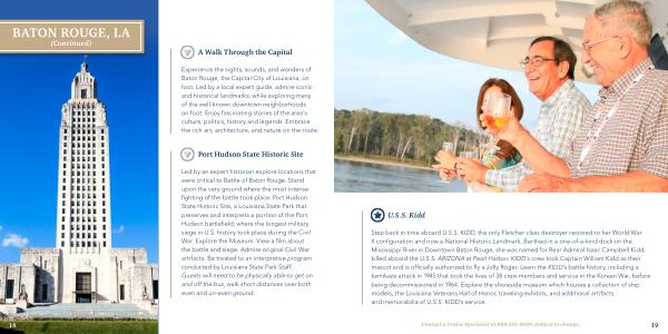 Experience the sights , sounds , and wonders of Baton Rouge , the Capital City of Louisiana , on foot . Led by a local expert guide , admire iconic and historical landmarks , while exploring many of the well-known downtown neighborhoods on foot . Enjoy fascinating stories of the area ’ s culture , politics , history and legends . Embrace the rich art , architecture , and nature on the route .