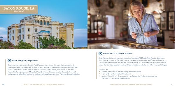 Begin your excursion at the Capitol Park Museum . Learn about the many diverse aspects of Louisiana , from Louis Armstrong to Mardi Gras . Continue to view the impressive Governor ’ s Hall and the New State Capitol . Admire the Old Louisiana State Capitol , also known as the State House . Finally , enjoy views of Magnolia Mound , a French Creole plantation house built in 1791 and a rare example of the architecture influenced by early settlers from France and the West Indies .