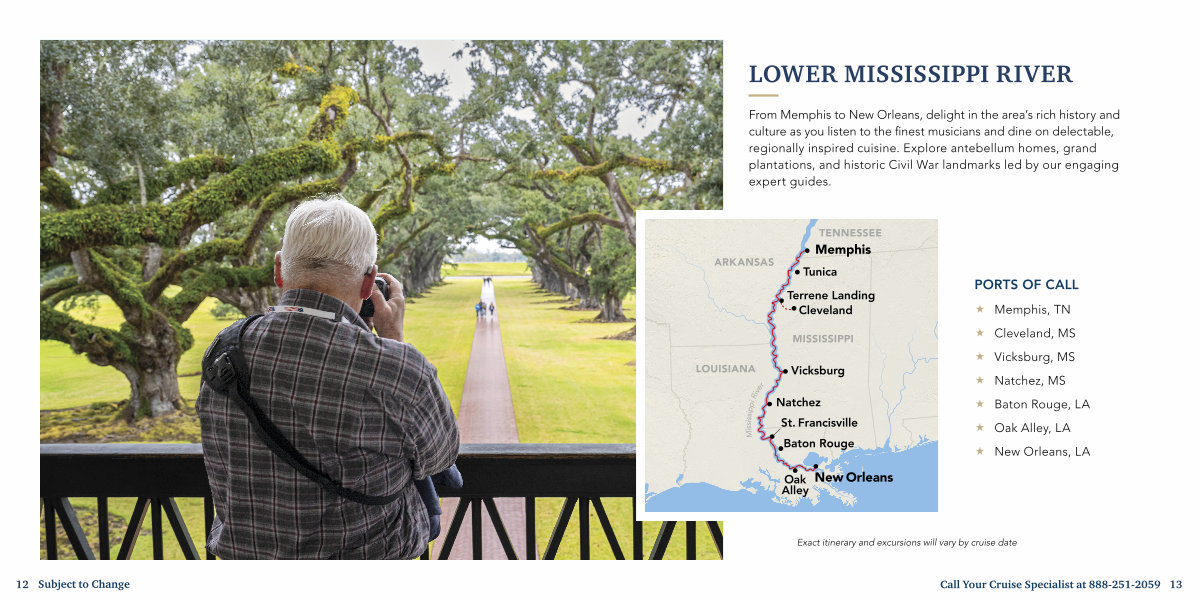 From Memphis to New Orleans, delight in the area’ s rich history and culture as you listen to the finest musicians and dine on delectable, regionally inspired cuisine. Explore antebellum homes, grand plantations, and historic Civil War landmarks led by our engaging expert guides.