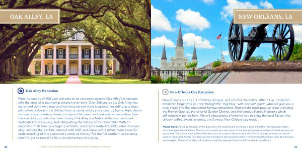 New Orleans is a city full of history , intrigue , and colorful characters . After a Cajun inspired breakfast , begin your journey through the “ Big Easy ” with a private guide , who will give you a local ’ s look into the area ’ s most famous attractions . Explore the most popular areas including the French Quarter , the colorful Garden District , and the famous Stately Mansions which still remain in period form . We will allow plenty of time for you to enjoy the local flavors , like chicory coffee , sweet beignets , and famous New Orleans jazz music .