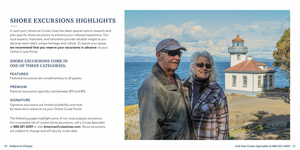 The following pages highlight some of our most popular excursions. For a complete list of current shore excursions, call a Cruise Specialist at 888-251-2059 or visit AmericanCruiseLines. com. Shore excursions are subject to change and will vary by cruise date.