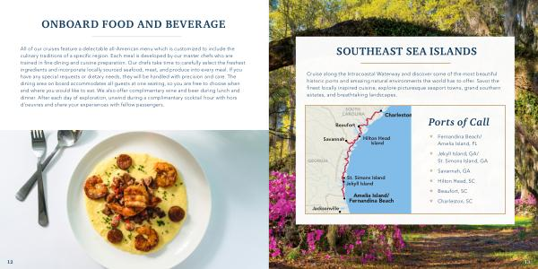 All of our cruises feature a delectable all-American menu which is customized to include the culinary traditions of a specific region . Each meal is developed by our master chefs who are trained in fine dining and cuisine preparation . Our chefs take time to carefully select the freshest ingredients and incorporate locally sourced seafood , meat , and produce into every meal . If you have any special requests or dietary needs , they will be handled with precision and care . The dining area on board accommodates all guests at one seating , so you are free to choose when and where you would like to eat . We also offer complimentary wine and beer during lunch and dinner . After each day of exploration , unwind during a complimentary cocktail hour with hors d ’ oeuvres and share your experiences with fellow passengers .