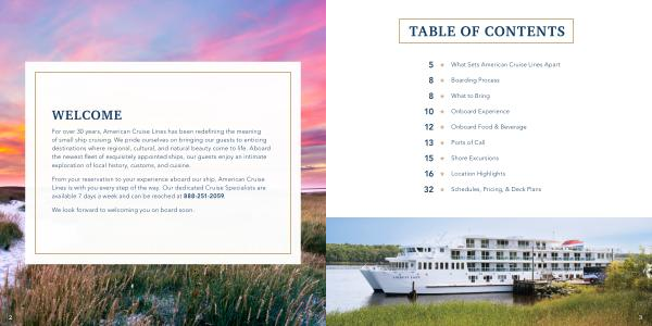 For over 30 years , American Cruise Lines has been redefining the meaning of small ship cruising . We pride ourselves on bringing our guests to enticing destinations where regional , cultural , and natural beauty come to life . Aboard the newest fleet of exquisitely appointed ships , our guests enjoy an intimate exploration of local history , customs , and cuisine .